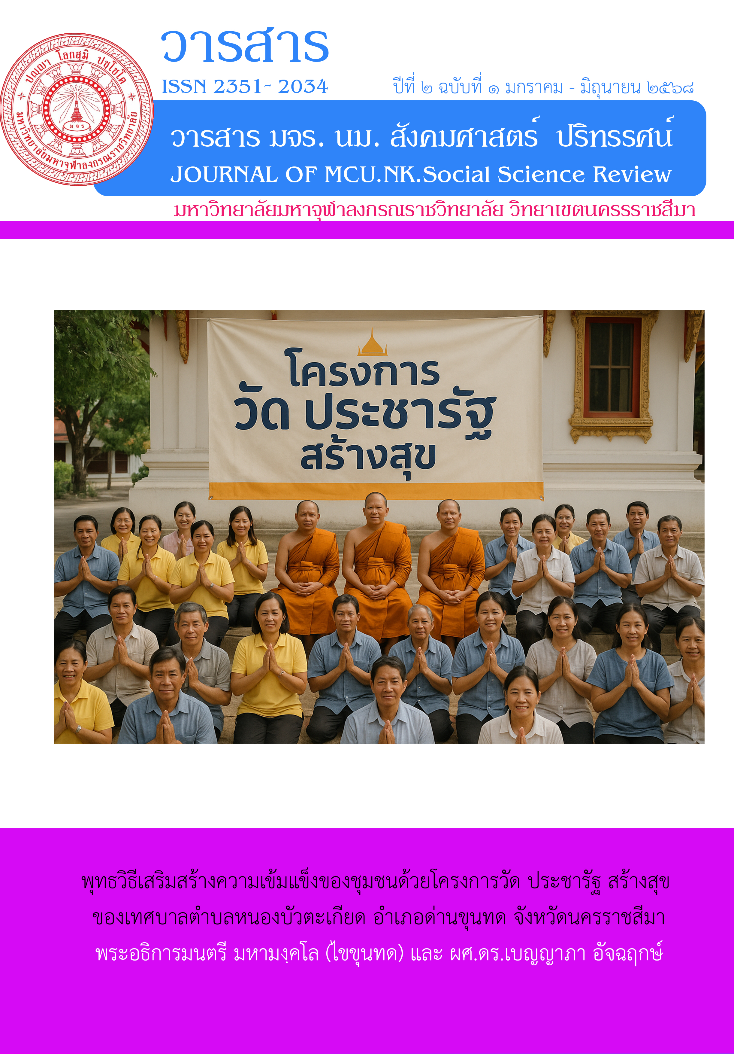 ด้วยวารสาร มจร. นม. สังคมศาสตร์  ปริทรรศน์   วิทยาเขตนครราชสีมาฉบับนี้เป็น ปีที่  1 ฉบับที่ 2 กรกฎาคม-ธันวาคม 2567  มีคณาจารย์ของมหาวิทยาลัยจากสถาบันภายนอกได้นำเสนอผลงานทางวิชาการที่หลากหลายหัวข้อหลากหลายสาขาวิชา ทั้งนี้กองบรรณาธิการได้ส่งผลงานทางวิชาการเหล่านี้ไปให้กรรมการกลั่นกรองบทความทางวิชาการของแต่ละสาขาวิชาเป็นผู้อ่าน และมอบให้เจ้าของบทความนำไปปรับปรุงแก้ไขก่อนการตีพิมพ์แล้ว และด้วยความตั้งใจของกองบรรณาธิการที่มีความประสงค์จะทำวารสารเล่มนี้ให้สมบูรณ์ตามเกณฑ์ของศูนย์ดัชนีการอ้างอิงวารสารไทย (Thai Journal Citation Index Centre) ฉะนั้น  ในวารสารฉบับนี้เน้นการนำเสนอบทความวิชาการด้านวิจัย 2 เรื่อง และบทความวิชาการที่เป็นประโยชน์ต่อการบริการวิชาการทางพระพุทธศาสนาบูรณาการศาสตร์สมัยใหม่ พัฒนาจิตใจและสังคม 3 เรื่อง รวมเป็น        5 บทความ
